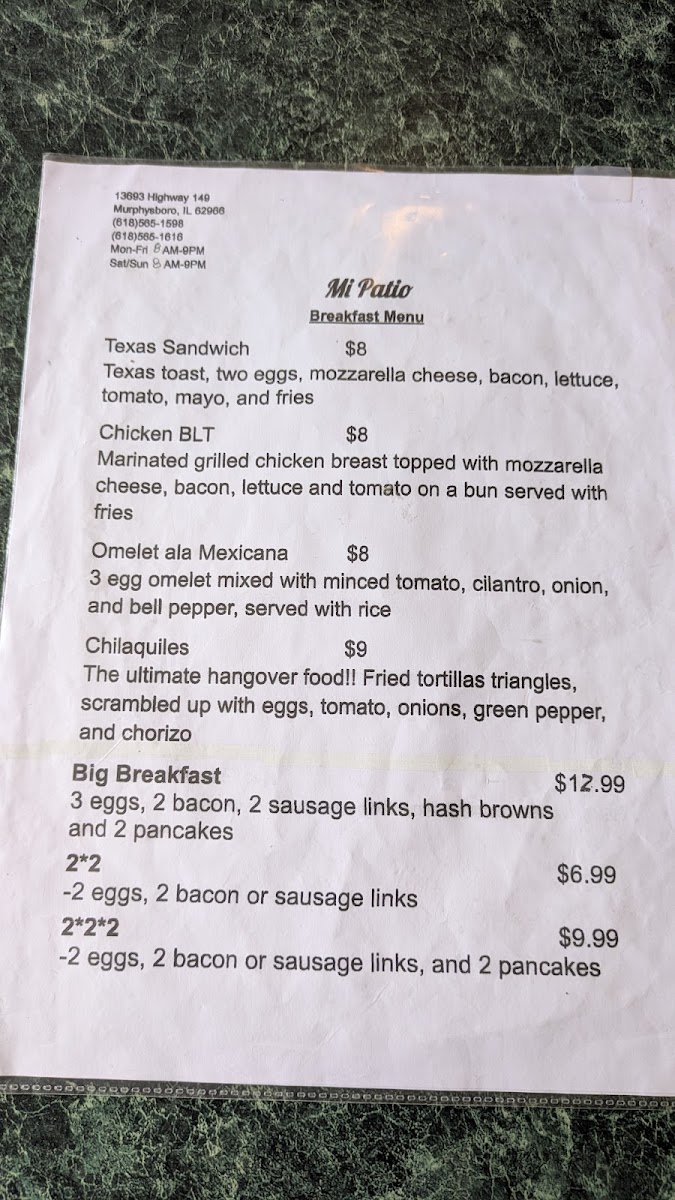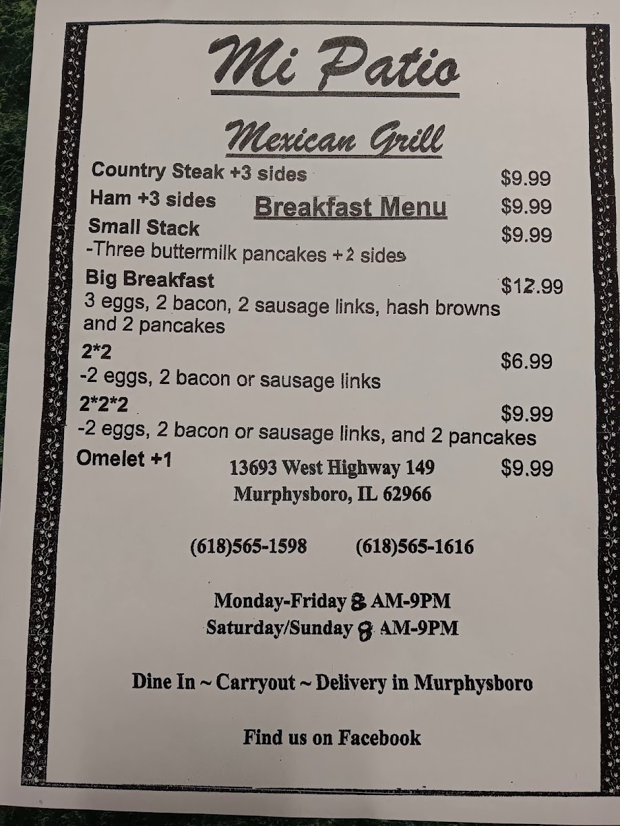 If you’re curious about what’s cooking at 13693 IL-149 in Murphysboro, the Mi Patio Mexican Grill Menu is where the real story begins. From the first glance, it feels like a lineup built for comfort and flavor. You’ll spot sizzling fajitas arriving with that unmistakable aroma, cheesy enchiladas tucked under rich sauces, and burritos packed so generously they barely fit the plate. Then there are the tacos - simple, classic, and exactly what you hope for when you’re craving something bold and satisfying.